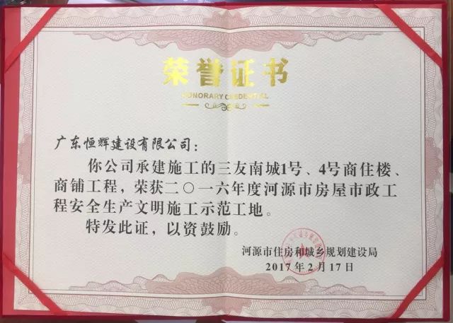 三友·南城(1#、4#)商住小区工程自施工以来,项目部本着“以工程质量求生存,以科学管理求效益”的理念,高起点高标准严要求,努力做到“开工必优,一次成优”,合理组织施工生产,做好安全质量标准化管理,做好日常管控检查,优质高效地完成了各个节点任务。项目工期、质量、安全及文明施工得到市各级主管部门、建设单位及监理的一致好评,并荣获“2016年河源市房屋市政工程安全生产文明施工示范工地”称号。