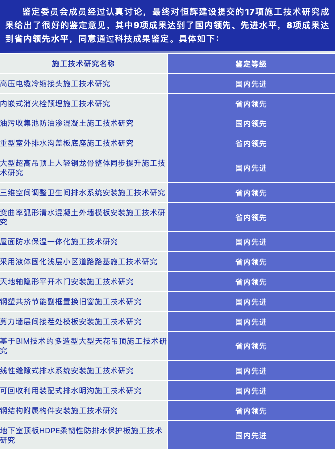 鉴定委员会成员经过认真讨论,最终对恒辉建设提交的17项施工技术研究成果给出了很好的鉴定意见,其中9项成果达到了国内领先、先进水平,8项成果达到省内领先水平,同意通过科技成果鉴定。具体如下: