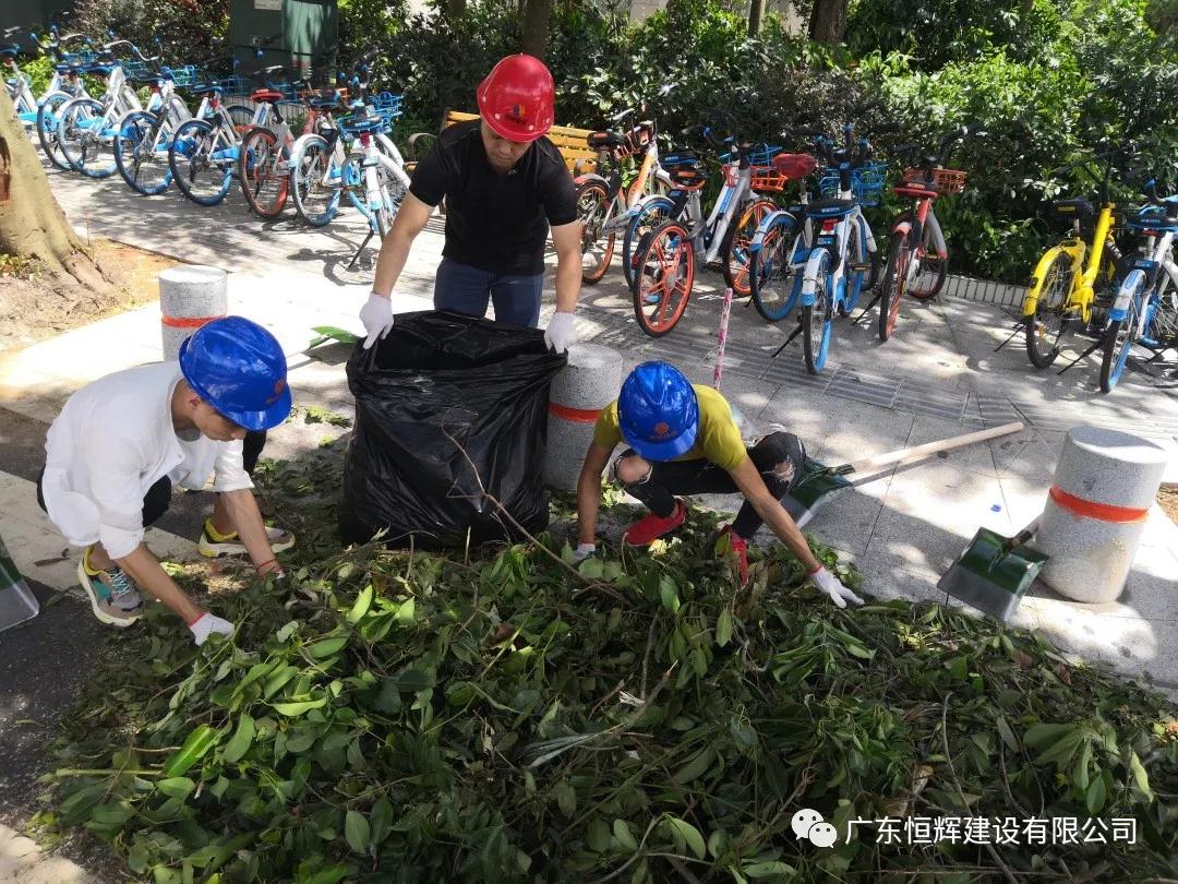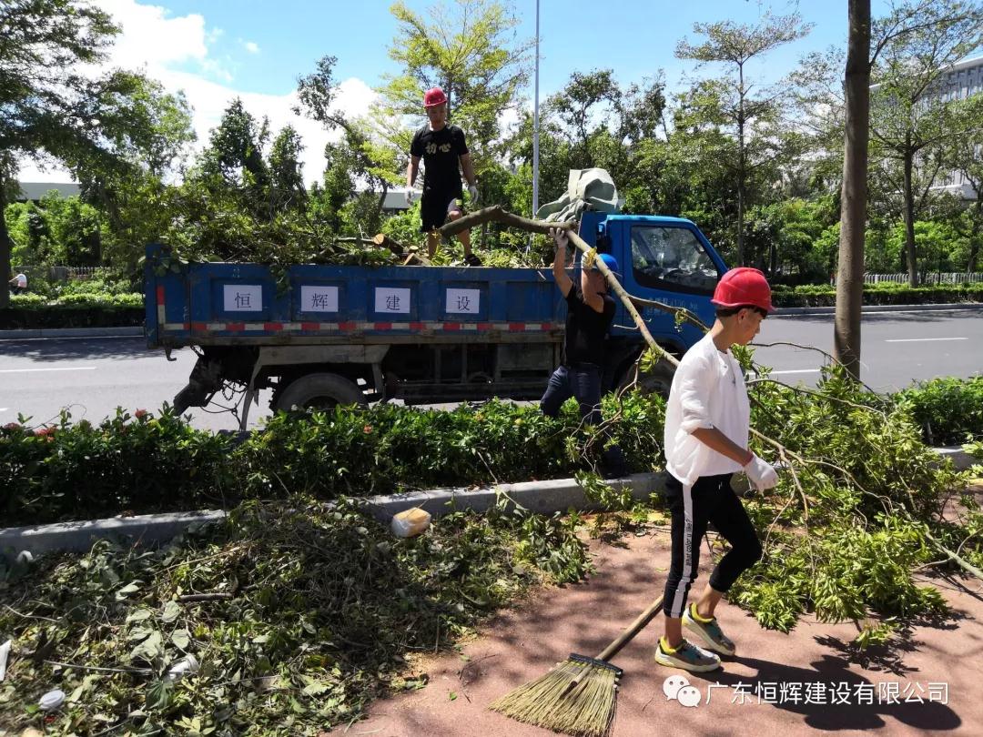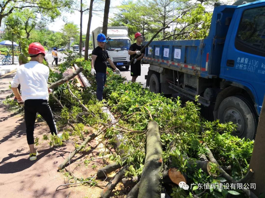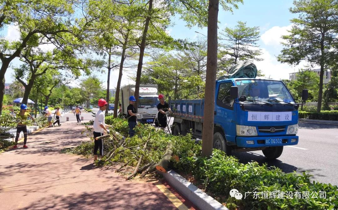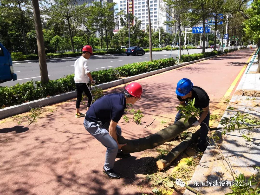 2018年9月18日,我司广东恒辉建设有限公司珠海分公司受珠海市建筑业协会委托,组织我司珠海分公司多名员工参加台风过后市政道路恢复工作,配合市政部门清理路面倒塌树木,尽早恢复交通,保障人们的顺利、安全出行。