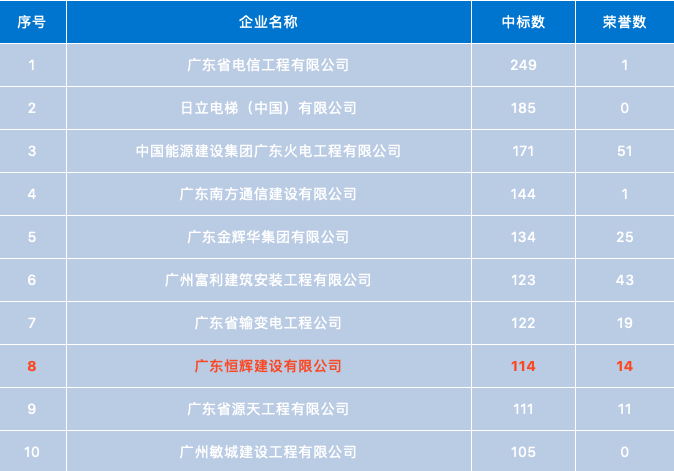 据建筑网(www.cbi360.net)综合数据统计显示,在2017年,广东建筑施工企业中标数量达37562项,同比(与去年同期)上升8.89%。其中,我司广东恒辉建设有限公司跻身前十强,排名第八。