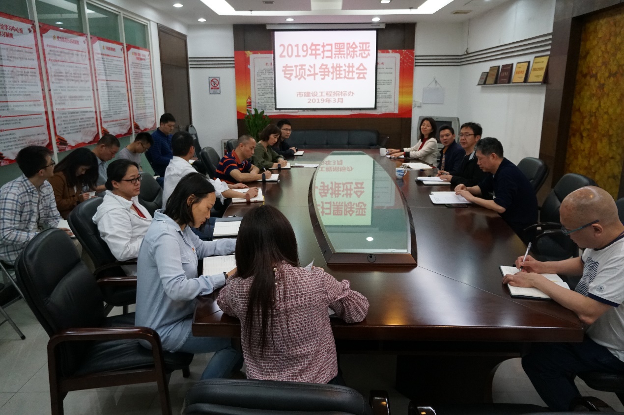 3月20日,市建设工程招标办召开2019年扫黑除恶专项斗争推进工作会议,全体干部参加会议。会议传达学习了省市扫黑除恶专项斗争有关会议精神及市住房城乡建设局2019年扫黑除恶工作要求,安排部署了下一阶段工作。